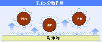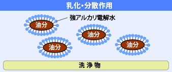 乳化させる事によって油汚れをこすらず簡単に洗い流すことが出来ます。最終的には油分は分解、水に分散します。