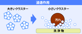 水を電気分解することで作られたアクア・ピュールは、クラスター(水分子の集まり)が更に細かい「単独クラスター」に分解されて界面活性効果と浸透性が高くなり、洗浄物と汚れの隙間に入り込み汚れを浮き上がらせます。